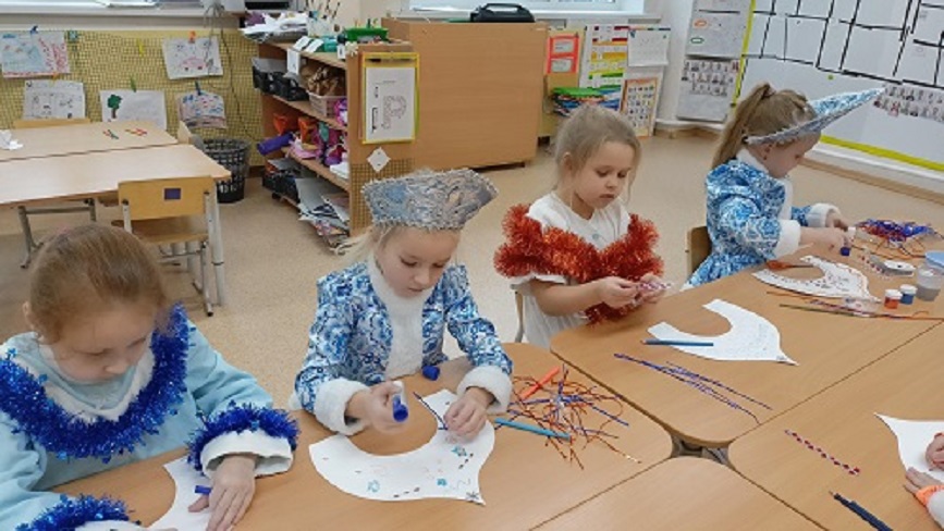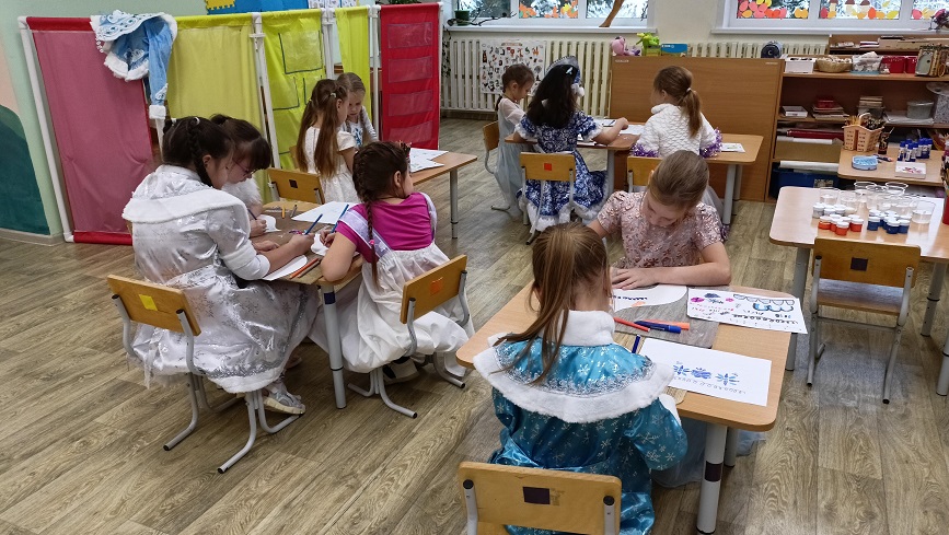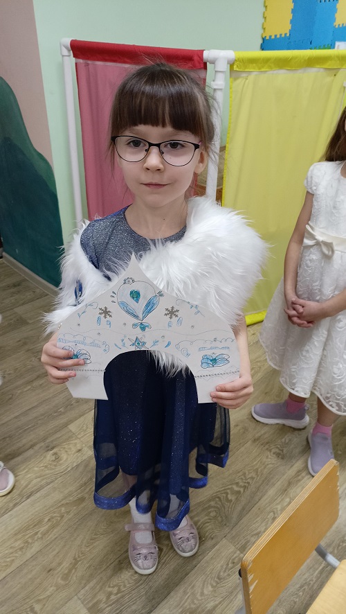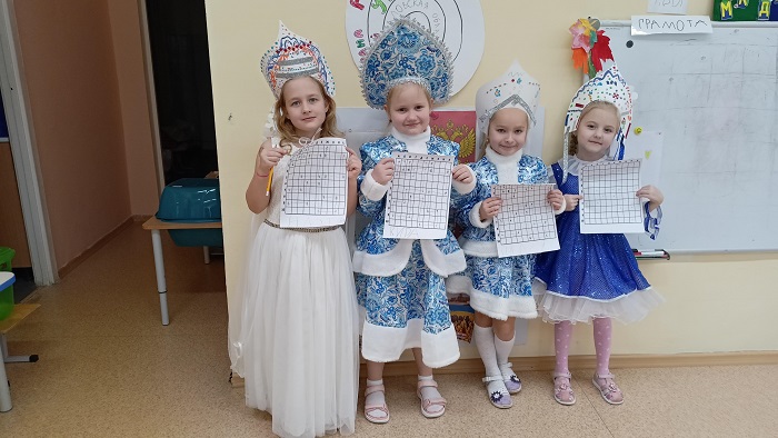 Наши девоньки не растерялись, не зря тренировались расписывать эти узоры с нашим художником Ксенией Александровной. Сотворили кокошники, что не в сказке сказать, ни пером описать, да все наказы Снегурочки выполнили. Вот у Александры наряд так был пошит, что ни сидеть, ни лежать нельзя в нём, так она чего удумала, стоя кокошник свой расписывала!
