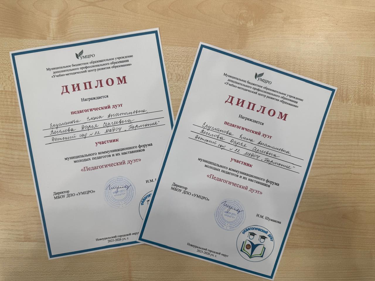 Сегодня, в последний день октября, педагоги детского сада № 22 «Надежда» Ерусланова Елена Анатольевна и Веселова Дарья Сергеевна приняли участие в муниципальном коммуникационном форуме молодых педагогов и их наставников «Педагогический дуэт 2025». Форум проводится уже не первый год с целью создания условий для развития творческого потенциала и самореализации молодых педагогических работников и их наставников.