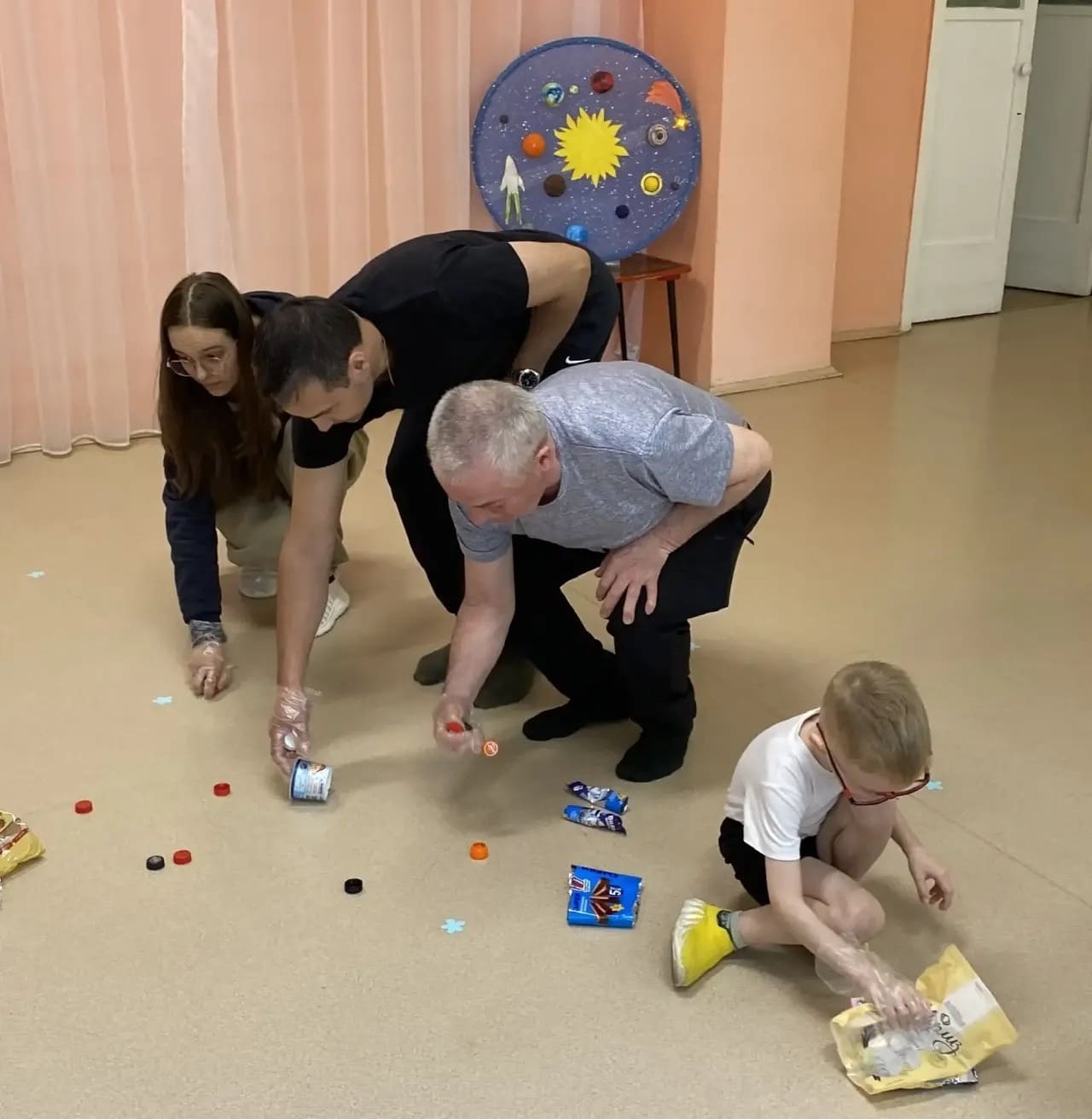 Дети увлечённо отгадывали «Космические загадки»,с азартом принимали участие в конкурсах: «Соберем космический мусор», «Невесомость».
