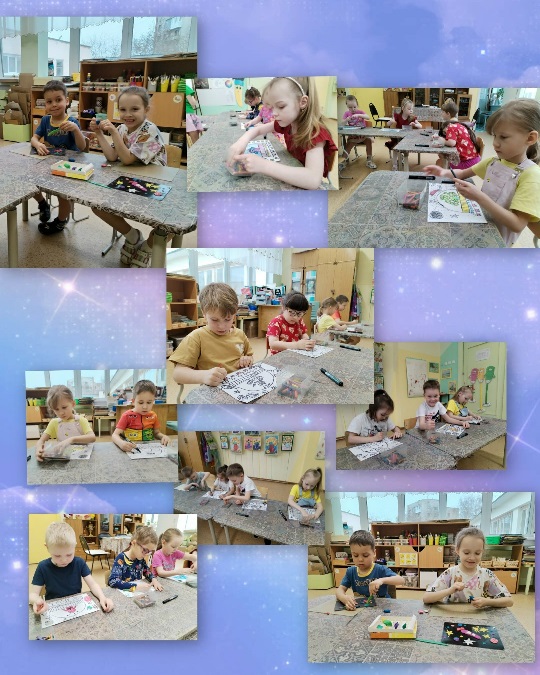 Под руководством воспитателя по изодеятельности ребята погрузились в мир космического пространства: узнали интересные факты про планеты Солнечной системы, увидели настоящие фотографии звездного неба и даже услышали космическую музыку.