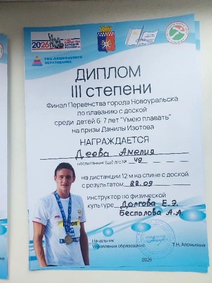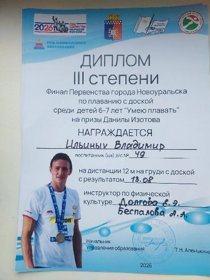 19 апреля 2026года воспитанники детского сада № 49 «Дом радости» приняли участие в традиционном первенстве города Новоуральска по плаванию с доской среди детей