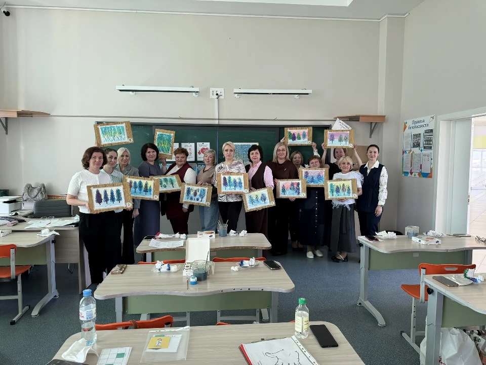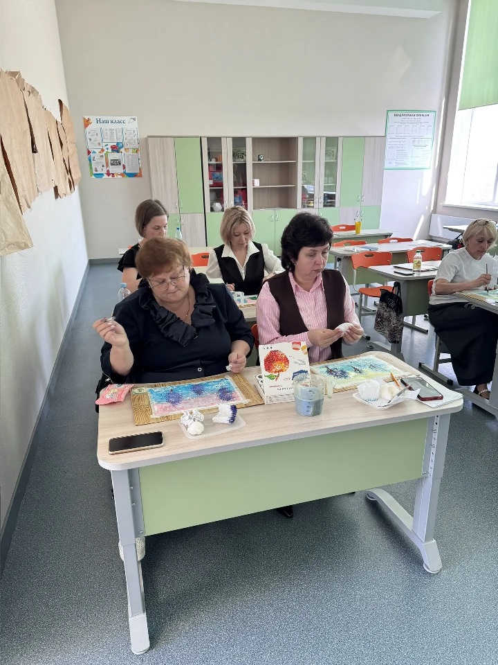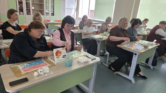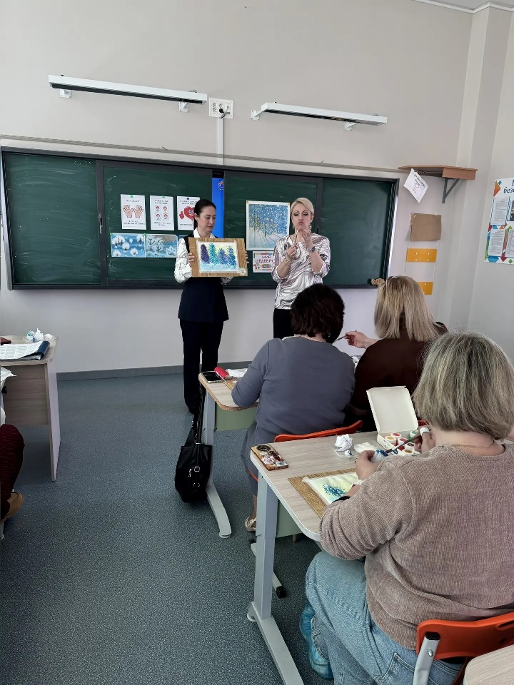 Педагоги показали игровые методы и мультисенсорные техники (сочетание зрительного образа с музыкой и поэзией, тактильными ощущениями) на примере анализа картины И. Э. Грабаря «Зимнее утро» с помощью модели «5 пальцев», которая представляет собой целостную технологию работы с художественными произведениями. А затем, вдохновившись картиной, участники осваивали методику интуитивного рисования с использованием нетрадиционных инструментов для создания собственных шедевров.