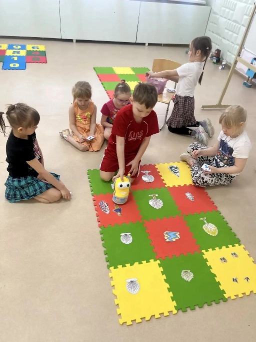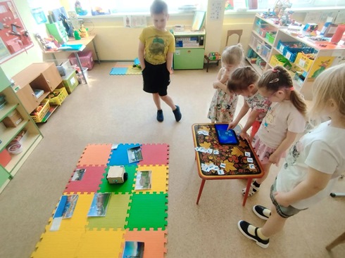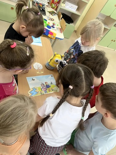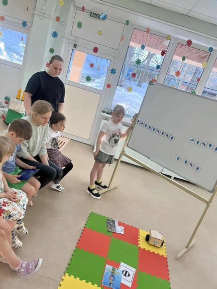 Чтобы закрепить полученные знания, воспитатель Острикова Т. А. предложила детям необычную игру, которую придумал сам робот Вертун – «Сказки Вертуна». Задание было непростым, но невероятно увлекательным: юным программистам предстояло использовать алгоритмы, чтобы провести робота по игровому полю, найти спрятанные картинки с весенней тематикой, а затем… придумать свою собственную необычную сказку!