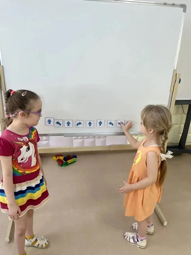 Дети с воодушевлением принялись за дело. Сначала они составляли пошаговые алгоритмы для Вертуна: куда ему нужно повернуть, сколько клеток пройти вперёд, где остановиться и закрасить нужную клетку, чтобы «добыть» картинку. Каждый шаг обсуждался, проверялся, ребята учились исправлять ошибки и точно следовать программе. Это задание позволило им на практике понять, как важно правильно выстраивать последовательность действий для достижения цели.