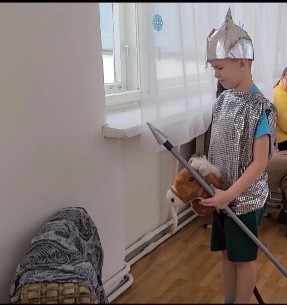 Особое внимание было уделено тому, как художники передают характер и дух защитников. Дети учились замечать выражение глаз, осанку, детали одежды, которые говорят о силе, решимости и благородстве. Обсуждались цвета, композиция, создающие атмосферу торжественности и героизма. Чтобы сделать погружение в мир защитников еще более ярким и запоминающимся, дети перевоплощались в настоящих героев! Специально подготовленные элементы костюмов – блестящие шлемы и внушительные палицы и мечи – позволили каждому ребенку почувствовать себя отважным воином, готовым встать на защиту своей земли. Дети с восторгом примеряли шлемы, представляя себя могучими богатырями из былин, и с гордостью брали в руки палицы, ощущая их вес и символическое значение. Это активное участие помогло им глубже понять роль и значение защитников, их силу и решимость.