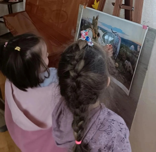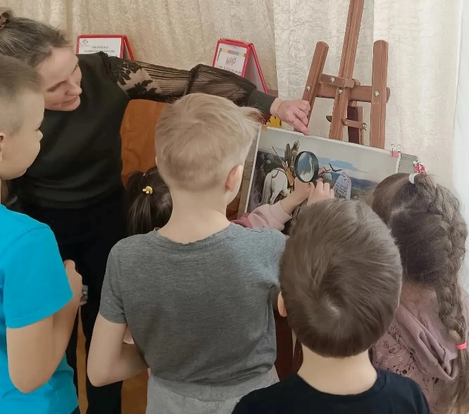 Метод «Волшебная лупа» позволил детям тщательно исследовать картину. Ребята самостоятельно искали три оттенка зеленой травы на пригорке, пушистые детали одежды и секреты гуслярских поз, с радостью делясь открытиями с родителями и друзьями.