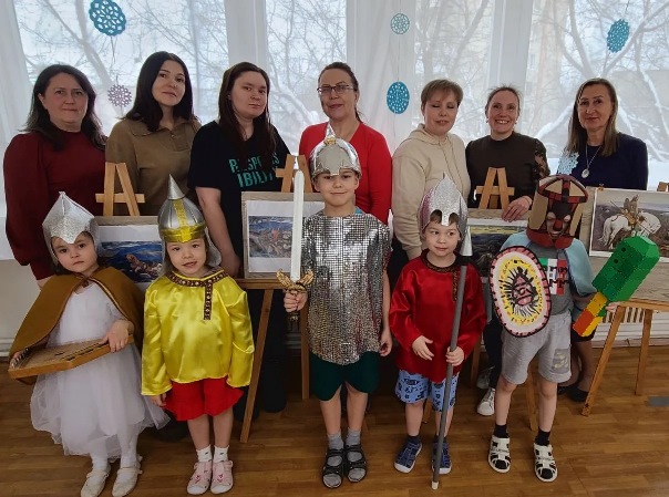 В картинной галерее детского сада № 49 «Дом радости» состоялось тематическое интерактивное мероприятие «Путешествие с богатырями» в рамках реализации федерального инновационного проекта «Картинная галерея в детском саду». Целью события являлась гармонизация детско-родительских отношений через совместное эмоционально-творческое погружение в мир сказочных образов русской живописи, а также развитие ценностно-смыслового восприятия искусства у детей