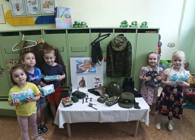 В группе «Солнышко» детского сада № 49 «Дом радости» подготовка к значимому событию, празднованию Дня Защитника Отечества, включало несколько мероприятий: выставка военной атрибутики и военной техники, изготовление поздравительных открыток для солдат,