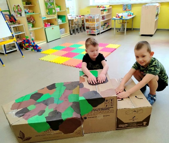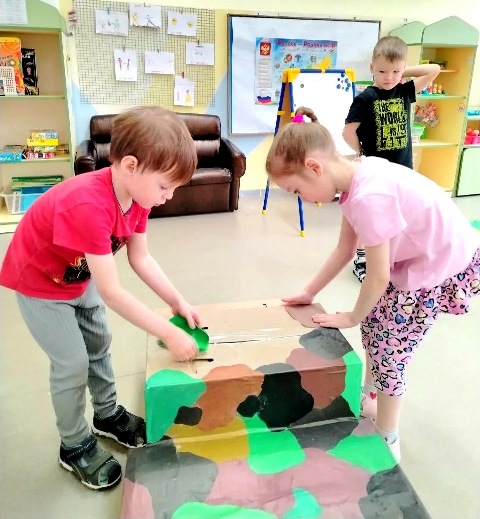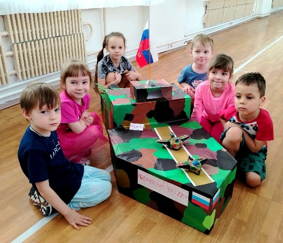 В преддверии Дня защитника Отечества в группе «Смешарики» детского сада № 49 «Дом радости» кипела серьезная работа – подготовка к выставке военной техники в детском саду. Группа превратилась в конструкторское бюро. Педагоги разработали схему военного корабля. Из подручного материала собрали корпус.