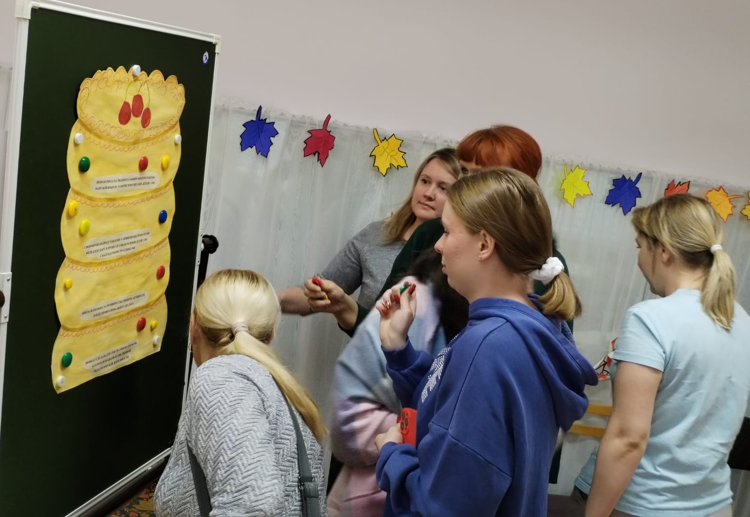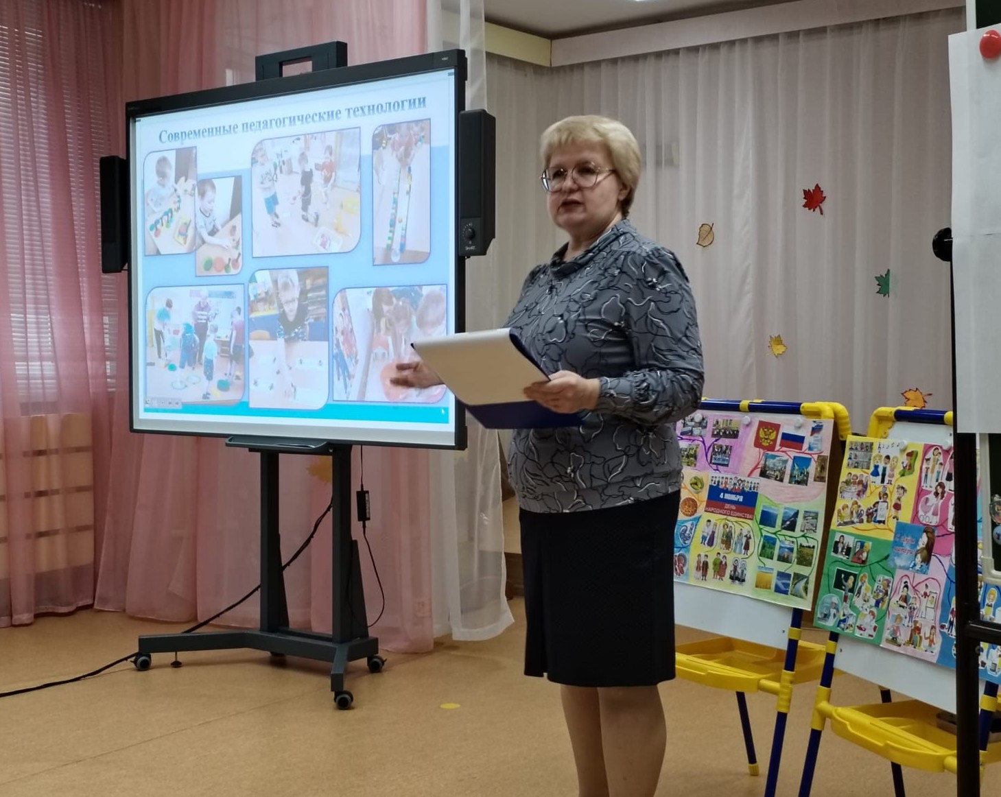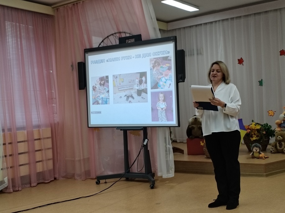 в практической части поделилась «собственным рецептом заявленного блюда» - оптимизированным вариантом применения технологии в работе с детьми с ОВЗ по ознакомлению календарными праздниками «День народного единства» и «День матери». Педагогам были представлены уже созданные тематические интеллект-карты и раскрыты педагогические приемы работы с детьми.