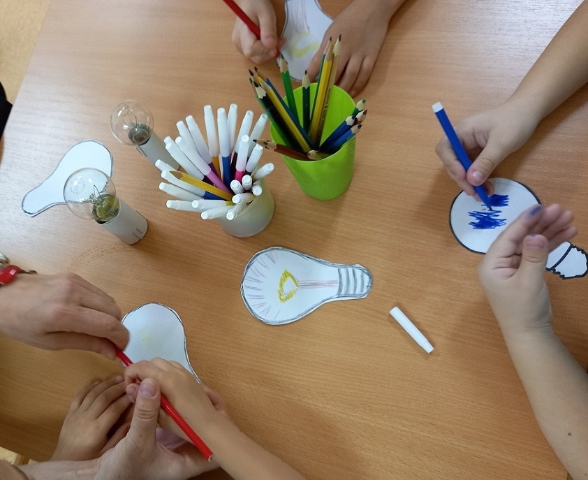 Ребята с воспитателями рассмотрели и нарисовали электрическую лампочку, которая освещает дом и детский сад.Затем посмотрели видеопрезентацию – как дома беречь электричество. В ходе беседы постарались запомнить важные правила энергосбережения: мама моет окна, чтобы чистые окна позволяли не включать дополнительно освещение, а главное – когда люди выходят из помещения, обязательно выключают свет!