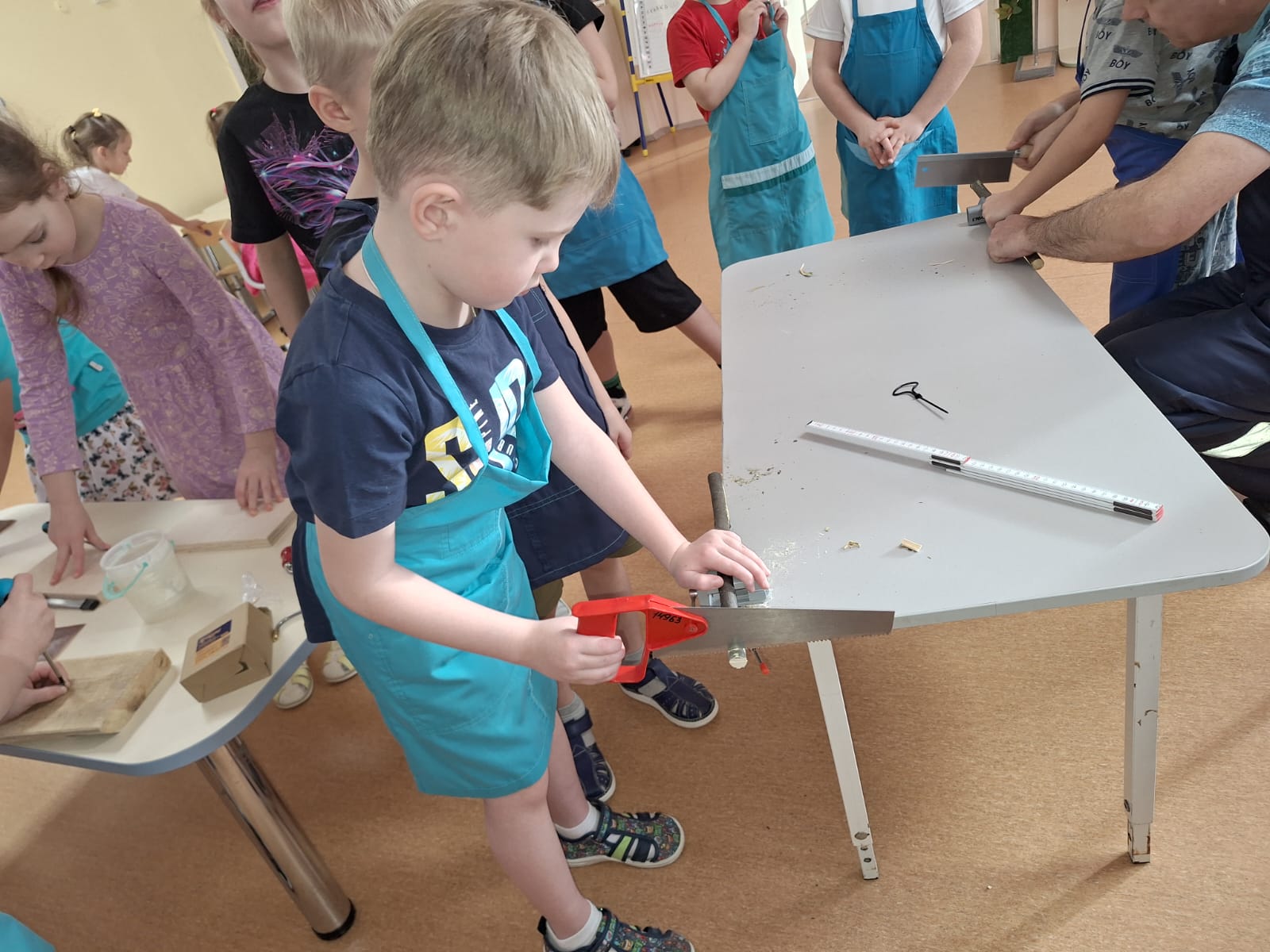 В столярную мастерскую Профицентра детского сада № 51 «Лесовичок» пришел гость Антон Владимирович, который умеет обращаться со столярным инструментом. Он решил познакомить ребят подготовительной группы «Кленок» (воспитатели Козина Е. А., Докучаева К. Н.) с этим увлекательным ремеслом. Дошкольники понимают, что у взрослых есть много интересных дел, и очень хотят быть похожими на них.