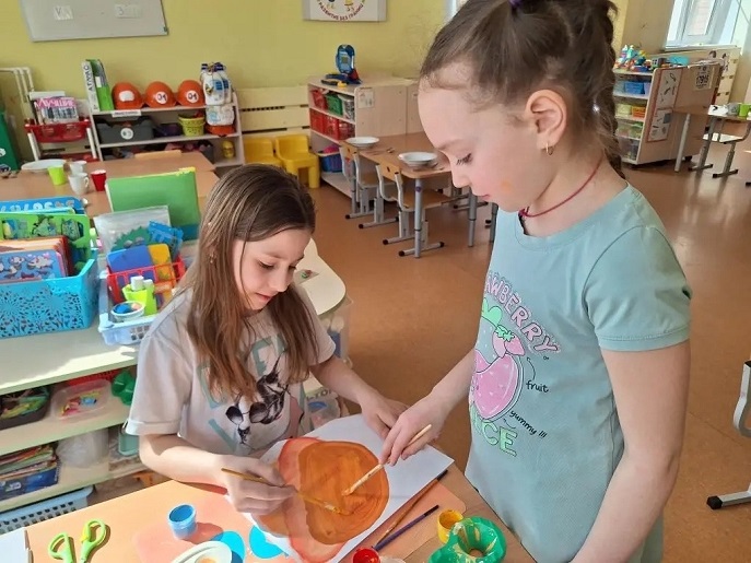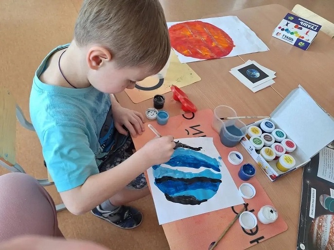 Затем в ход пошли кисти и краски - ребята создавали солнечную систему. Каждый рисовал свою планету: огненное Солнце, загадочный Юпитер, голубой Нептун…