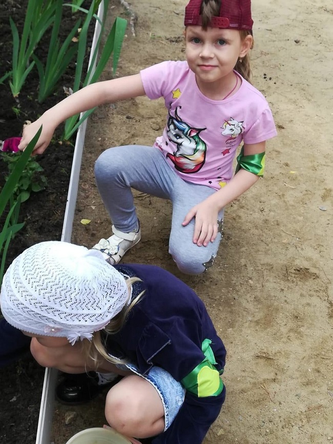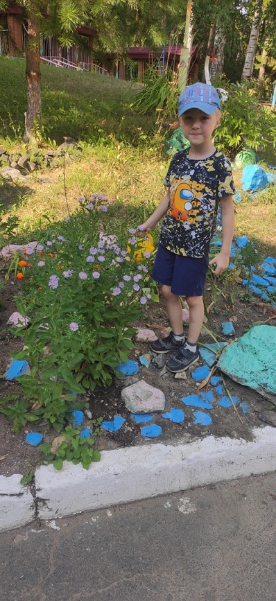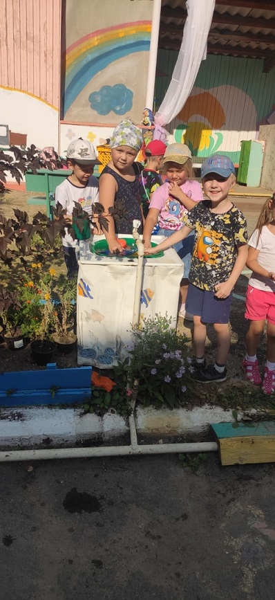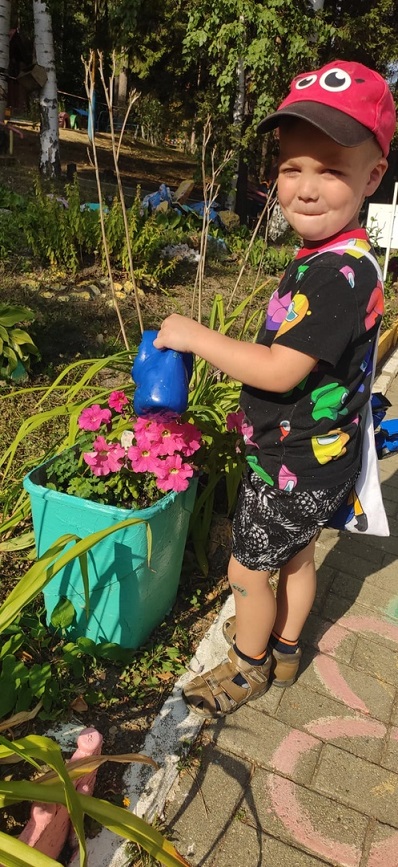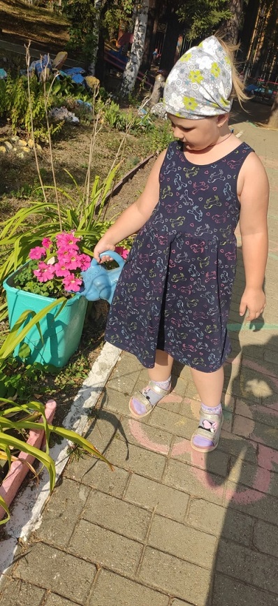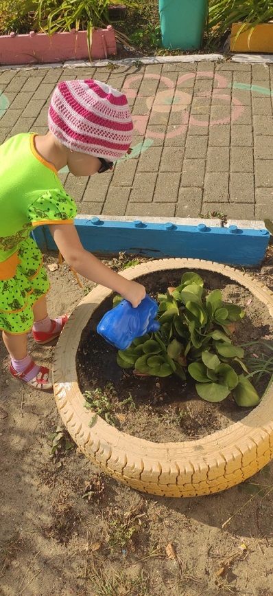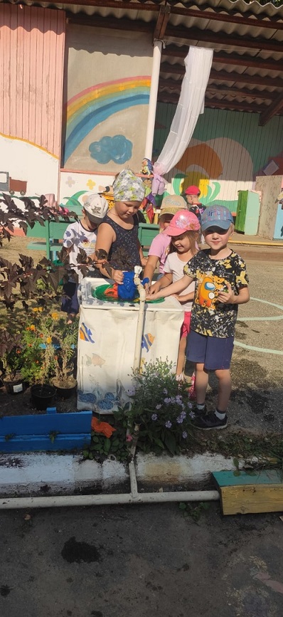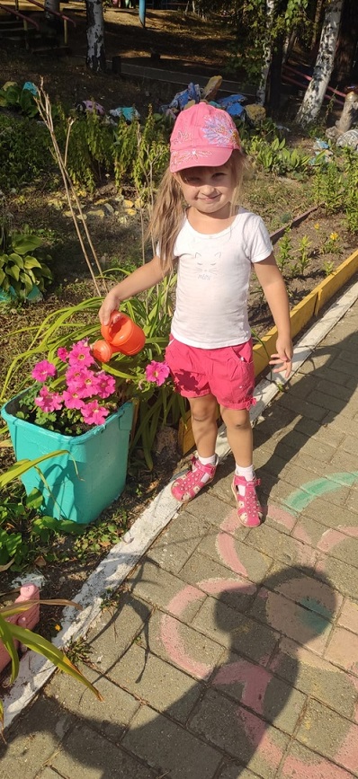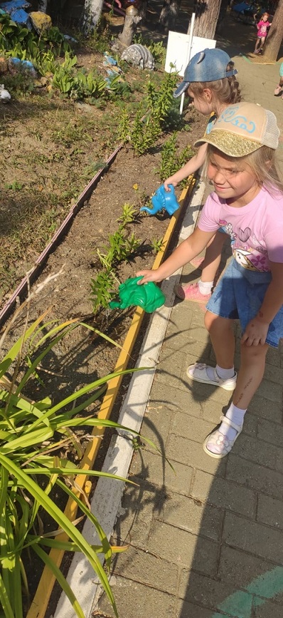 Лето - жаркая пора, вся природа в ожидании хорошего летнего ливня. Но пока прекрасные цветы на клумбах могут рассчитывать только на помощь членов отряда маленьких «Эколят». Ежедневно ребята из групп «Кленок» и «Елочка» заботятся о своих зеленых друзьях. Систематическая коллективная работа объединяет ребят, воспитывает у них трудолюбие и ответственность за порученное дело, доставляет им удовольствие и радость. Работая на участке, дети овладевают простейшими практическими навыками обращения с садовым инвентарем, усваивают приемы ухода за растениями (поливают, пропалывают, рыхлят землю), получают много сведений о росте и развитии растений. У них формируются умения определять по состоянию растений и почвы необходимость того или иного способа ухода, умения устанавливать связь между состоянием растений и трудом человека, направленным на удовлетворение потребностей растений. И растения благодарят малышей своей красотой.