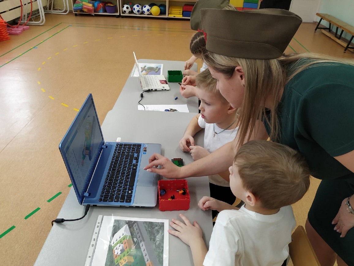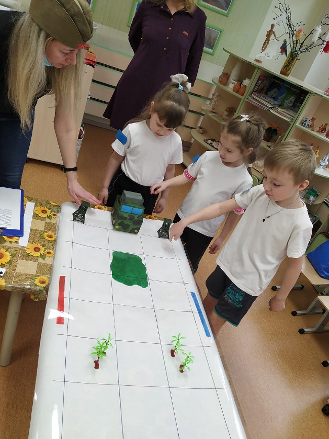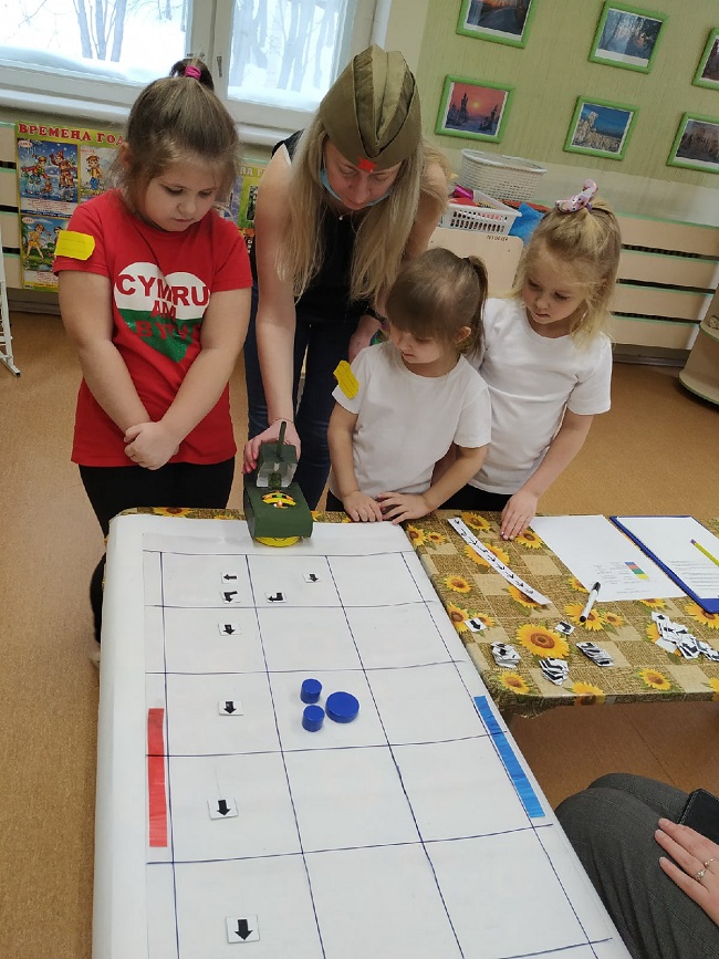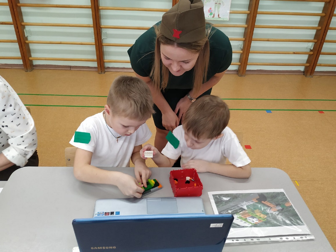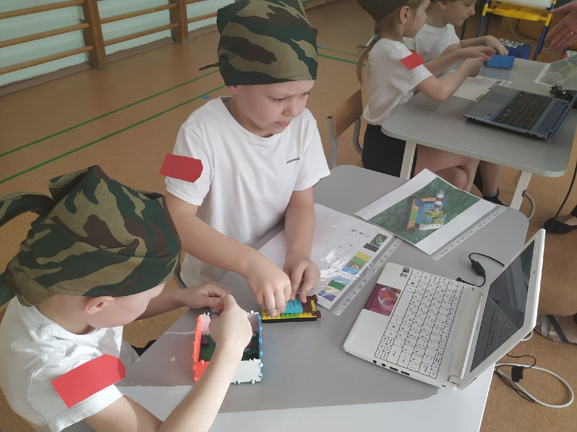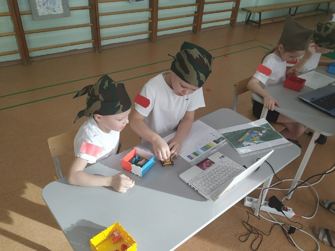 На станции «Школа курсантов» ребята продемонстрировали свою эрудированность в области знаний современных военных профессий в Российской армии (викторина с применением ИКТ-средств), они собрали из разрезных картинок различную военную технику и выложили ее название. На станции «Военные инженеры» курсанты проявили способности к моделированию военной техники (военная инженерия), используя 3-D модели на компьютере. На стации «Саперы на учениях» ребята решали «боевую задачу», ориентируясь и размещая военные объекты на различной местности (пустынной, лесной, горной, водной) по памяти (мнемотехника). На станции «Экстремальное вождение» нужно было доставить груз солдатам на боевой машине пехоты по пересеченной местности со сложными условиями для передвижения (программирование игрушки-робота). Курсанты имели возможность выбрать задания различной сложности. Очень радует, что почти все ребята стремились выполнить задания максимальной сложности либо индивидуально (по желанию), либо с партнером. Итогом было суммарное количество баллов, набранное взводом на станциях.