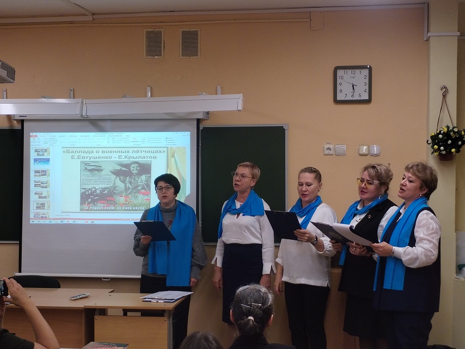 В заключение встречи ярким моментом мероприятия стало душевное исполнение песен «Баллада о военных летчиках» Е Крылатова и Е Евтушенко и песни «Надежда» А. Пахмутовой, Н Добронравова, коллективом учителей городских общеобразовательных организаций.
